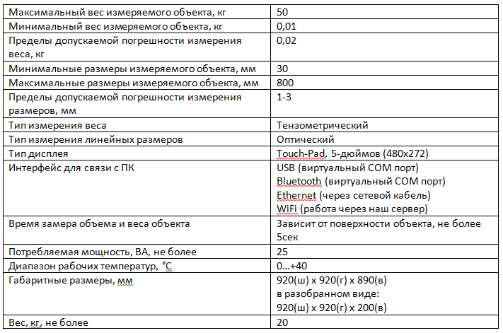 - визначення та запис у пам'ять про лінійні розміри упаковки за трьома осями X,Y,Z;